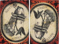 The subject material of these pictures is as delightful as it is confusing. Between the two images a cumulative six bearded men can be rotated 180⁰ to become wigged women, donkeys, and even a curious-looking goat. Clothed in a blue and white linen hood, ruff, feathered hats, and inconspicuously disguised donkey headgear; these characters appear to be dressed in stage-costumes that would have been anachronistic years before their suspected make. The objects’ lack of 3-dimensional texturing, the presence of striations, and the general style seem to indicate that the two are chromolithographs, which would place them sometime between the turn of the 20th Century and as late as the 1930s. The content, time period, and that both images were hand-cut to be inserted into their frames make it likely that the two were originally prints created to advertise something: a theater production, miracle beard-grow tonic—a rationale for the overwhelming number of hairy faces seen in the two topsy-turvies—razors, or matches like the above Spanish-language brand with a strikingly similar man-donkey to what’s seen in our Ambiguous Image of Four Men, One Woman and a Donkey; these are all possible candidates.