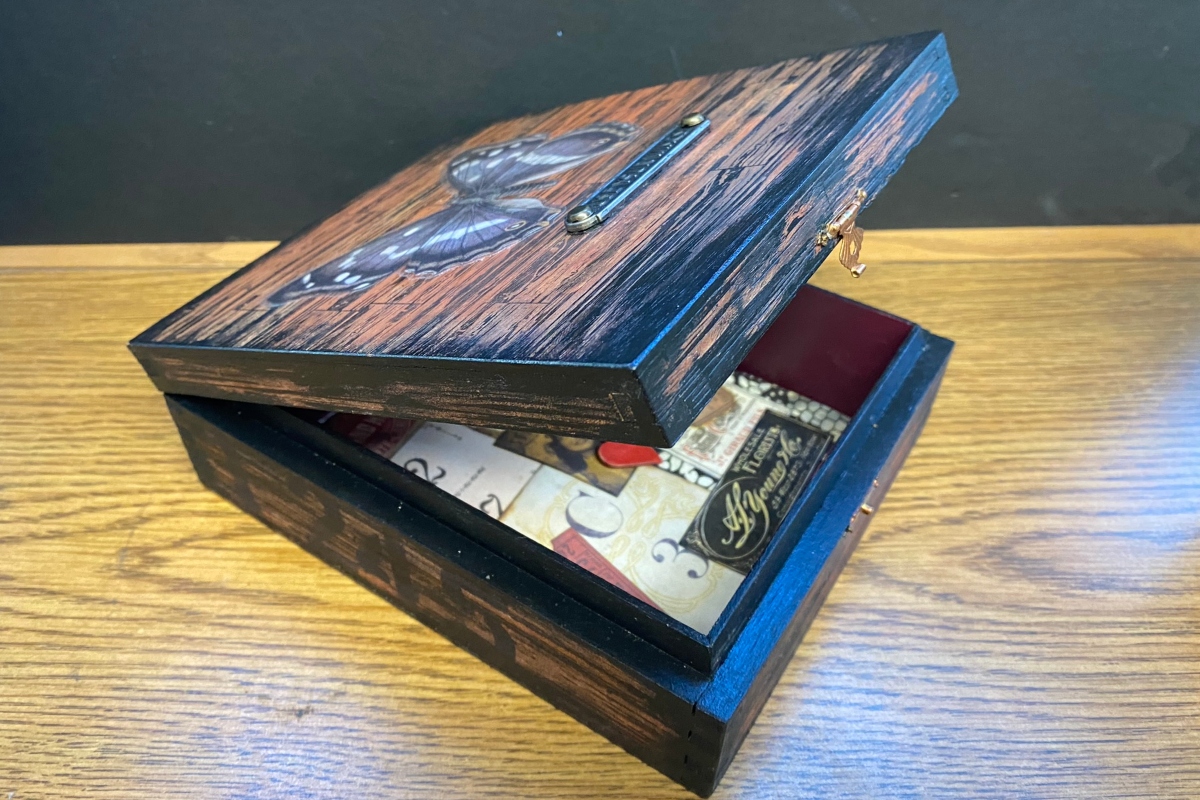 Transform a simple cigar box into a beautiful keepsake for photos or treasured items using jewels, beads, paint, and other creative accents.